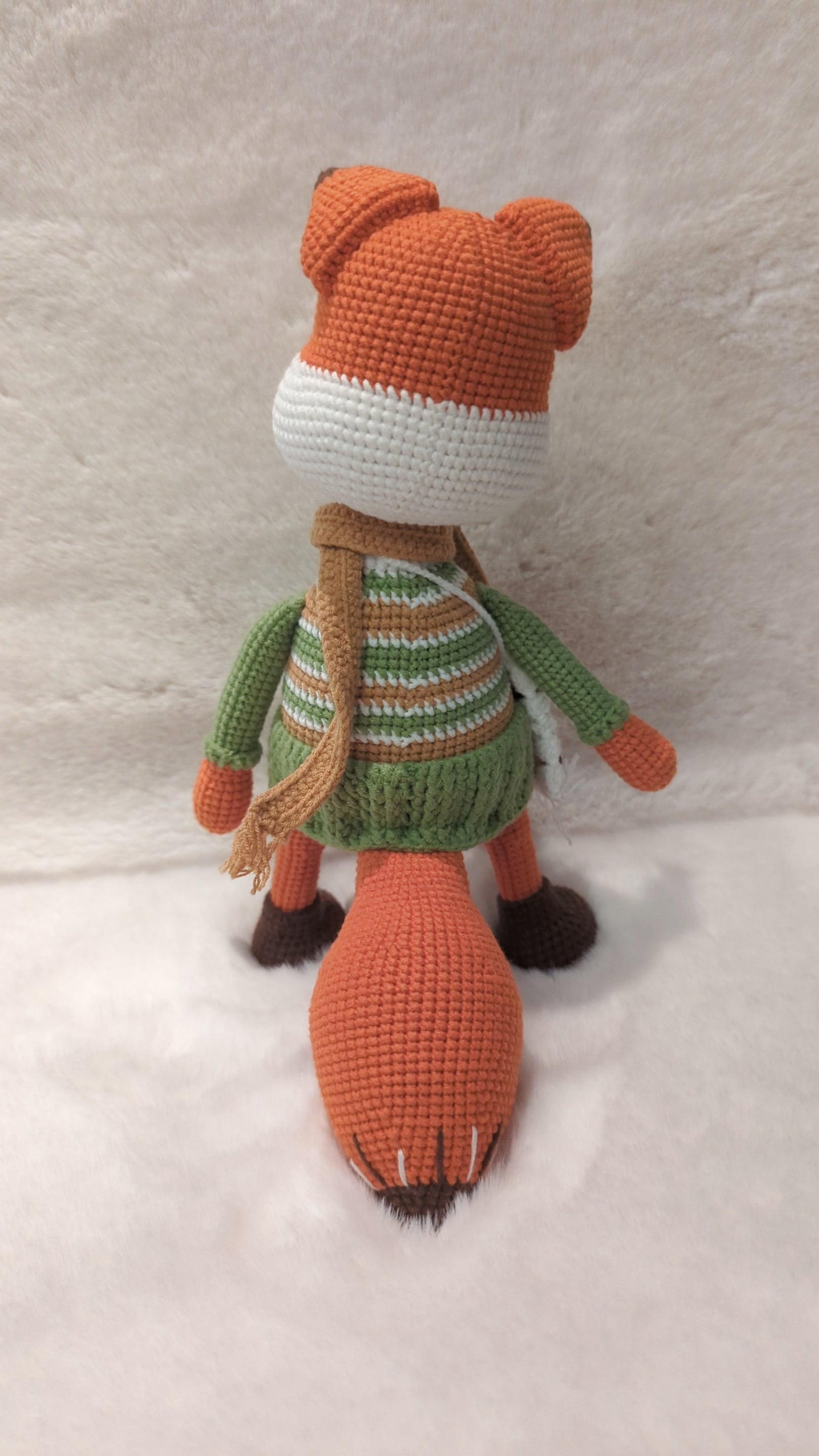 Meet this charming handmade crochet fox doll, perfect for those who love cute and cozy handmade creations! This adorable fox is dressed in a green and brown striped sweater, paired with a stylish scarf and a tiny crossbody bag—a true little traveler ready for adventures!