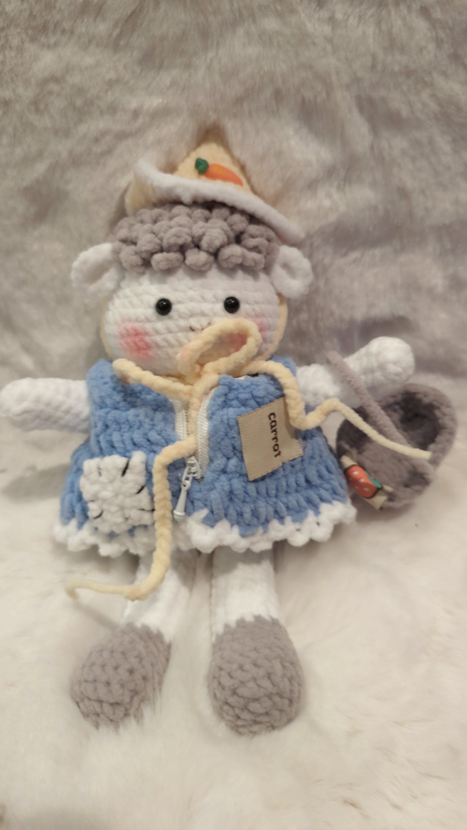 This sweet lamb is dressed in a stylish yellow witch-style hat, adorned with a playful carrot, bringing a whimsical touch to her look. She sports a cozy blue jacket with a zipper and holds a small grey basket, adding to her charming character. Her soft, fluffy white body is accented with a hint of grey hair, giving her a unique, endearing style. With tiny embroidered features, she exudes a cheerful and friendly expression that’s hard to resist.