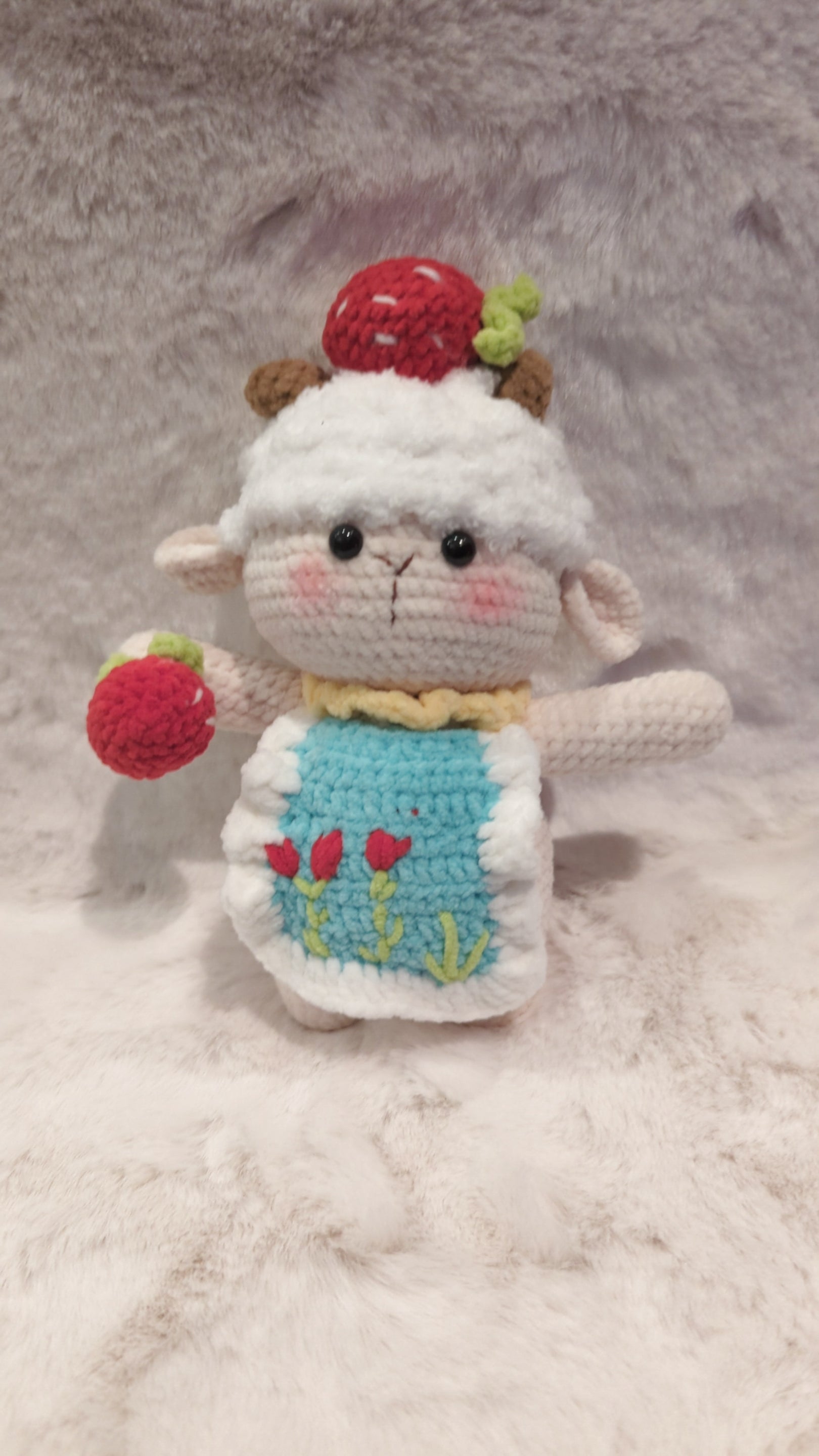 This white lamb is dressed to impress with a small apron decorated with vibrant tulips, adding a touch of floral charm. She holds a bright red strawberry in her hands and even has another perched on her head, bringing a playful and cheerful vibe. Her soft, fluffy texture and tiny embroidered features give her an endearing expression that’s hard to resist.